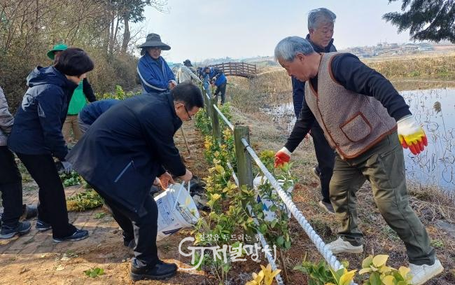 이날 행사에는 이장협의회, 주민자치위원회 등 5개 단체에서 70여명이 참여하여 흥덕제 산책로 주변에 황금사철나무 1100여 그루를 식재했다.