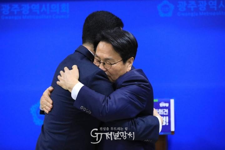 ![]() 신정훈 예비후보와 강기정 전 후보가 공동회견을 마치며 포옹하고 있다. (신정훈 의원실 제공) |
