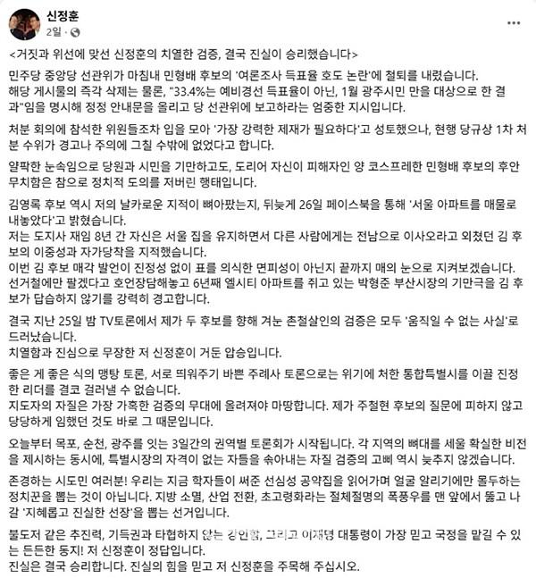 또한 “지도자의 자질은 가장 가혹한 검증의 무대에 올려져야 마땅하다. 얄팍한 눈속임으로 당원과 시민을 기만하고도, 도리어 자신이 피해자인 양 코스프레한 민형배 후보의 후안무치함은 정치적 도의를 저버린 행태다”고 지적했다.