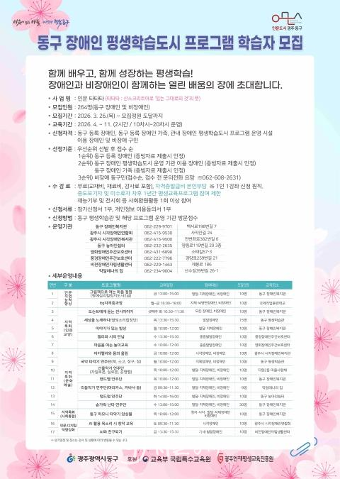 동구 관계자는 “이번 특성화 사업을 통해 장애인의 학습권을 실질적으로 보장하고, 인문과 디지털이 융합된 ‘동구형 평생학습 모델’을 확산해 나가겠다. 앞으로도 누구나 차별 없이 배우고 성장할 수 있는 장애친화 평생학습도시를 만들어 가기 위해 최선을 다하겠다.”고 했다.