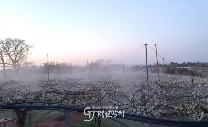 ![]() 나주시농업기술센터는 배꽃 개화기를 맞아 저온 및 서리 피해를 최소화하기 위해 비상근무 체계를 가동한다. 저온서리피해를 예방하기 위해 미세살수장치를 가동하고 있는 현장. (사진 제공-나주시) |