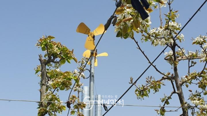 ![]() 나주시농업기술센터는 배꽃 개화기를 맞아 저온 및 서리 피해를 최소화하기 위해 오는 4월 15일까지 2주간 비상근무 체계를 가동한다. 사진은 저온서리피해를 예방하기 위해 설치된 방상팬. |