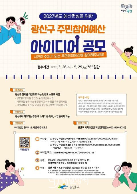 광산구 관계자는 “광산의 더 나은 내일을 만들 시민의 다양한 아이디어를 내년도 주민참여예산에 담아 현실로 만들 수 있게 지원하겠다. 지역 변화의 주체가 될 많은 시민의 적극적인 참여를 부탁드린다.”고 했다.