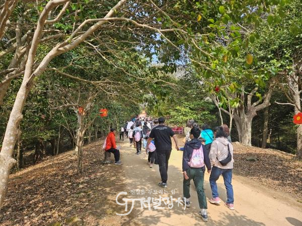 이날 오전 9시 50분, 백련사 동백축제장 주 무대에 집결한 참가자들은 간단한 준비운동을 마친 후 본격적인 걷기에 나섰다. 코스는 축제장 무대를 시작으로 다산박물관 주차장을 거쳐 다시 돌아오는 왕복 4km 구간으로 구성됐다. 약 1시간 40분 동안 참가자들은 천연기념물로 지정된 만덕산 동백숲의 정취를 만끽했다.