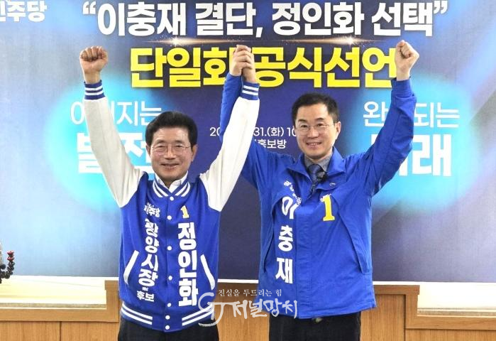 더불어민주당 이충재 광양시장 예비후보는 31일 오전10시30분 광양시청 열린홍보방에서 정인화 예비후보와의 단일화를 전격 선언하며 ‘광양 재건’을 위한 원팀 (One-Team)의 탄생을 알렸다.