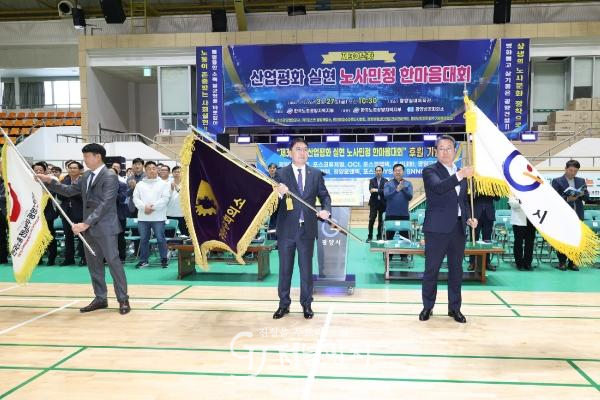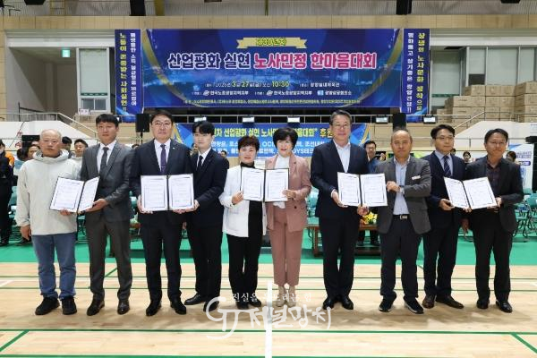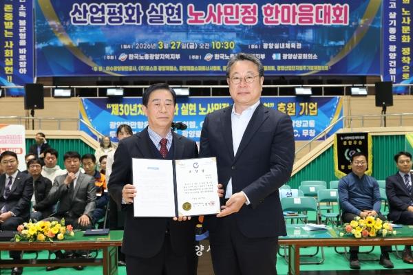 1부에서는 산업평화 정착과 지역발전에 기여한 모범근로자 19명에게 표창장을 수여했다. 이어 노사민정 대표가 함께 서명한 「광양시 노사민정 산업평화 공동선언」을 채택하며 상생 협력 체계 구축과 신뢰 기반 노사문화 정착을 통해 지역경제 활성화에 힘을 모으기로 했다.