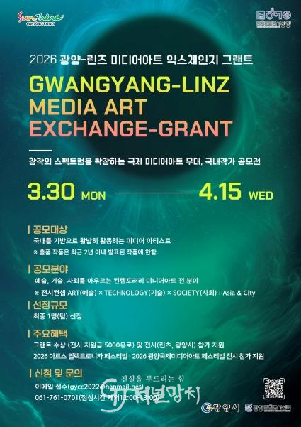 광양문화도시센터장은 “이번 미디어아트 익스체인지 그랜트는 국내 작가들이 세계적인 미디어아트 플랫폼과 교류하며 성장할 수 있는 계기가 될 것”이라며 “기술과 사회의 접점에서 새로운 예술적 담론을 제시할 작가들의 많은 관심과 참여를 바란다.”고 밝혔다.