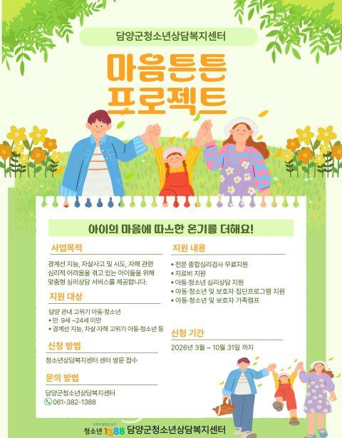 한편, 담양군청소년상담복지센터는 9세부터 24세까지 청소년을 대상으로 심리·정서 상담, 집단 프로그램, 부모교육, 학교 밖 청소년 지원 등 다양한 맞춤형 지원을 제공하고 있다.