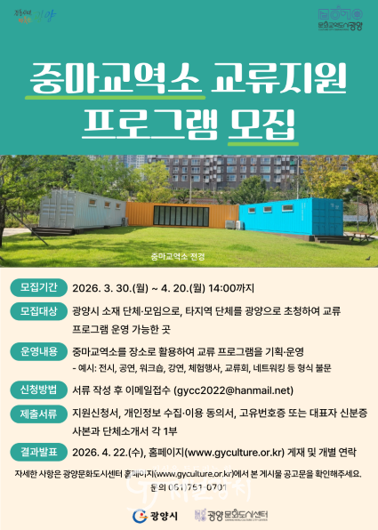 프로그램 운영 기간은 2026년 5월부터 11월까지이며, 선정 단체는 기간 중 1회 중마교역소 공간을 활용해 교류 프로그램을 진행하게 된다. 광양문화도시센터는 이번 사업이 지역 간 문화교류를 넓히고 시민 참여형 문화 활동을 확산하는 계기가 될 것으로 기대하고 있다.