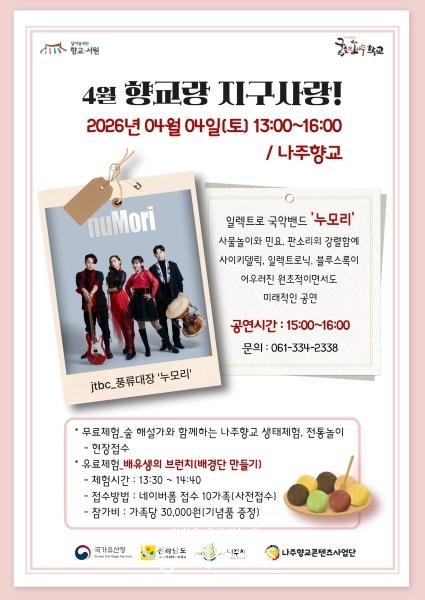 한편 ‘나주향교 굽은 소나무학교’는 국가유산청과 전라남도, 나주시가 주최하고 나주향교콘텐츠사업단이 위탁받아 운영하는 지역 문화유산 활용사업으로 4월부터 11월까지 체험과 공연, 숙박형 프로그램 등 다양한 콘텐츠를 선보일 계획이다.