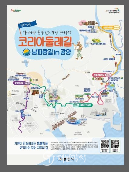 한편, 코리아둘레길은 동해안·서해안·남해안·DMZ 평화의 길을 연결한 약 4,500km 규모의 도보 여행길이다. 이 가운데 남파랑길은 부산에서 해남까지 남해안을 따라 이어지는 구간으로, 해안과 도시 풍경을 함께 즐길 수 있는 걷기 길이다. 특히 광양 구간은 섬진강과 광양만, 도심과 산, 문화예술 자원이 연결돼 있어 사계절 다양한 테마를 즐길 수 있는 것이 특징이다.