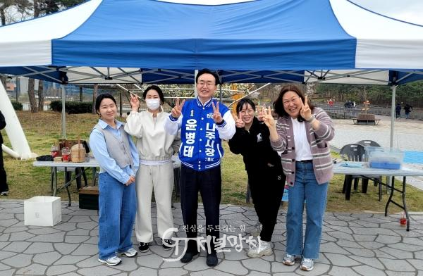 ![]() 윤병태 나주시장 예비후보가 빛가람동 호수공원에서 지지자들과 사진을 찍고 있다. |