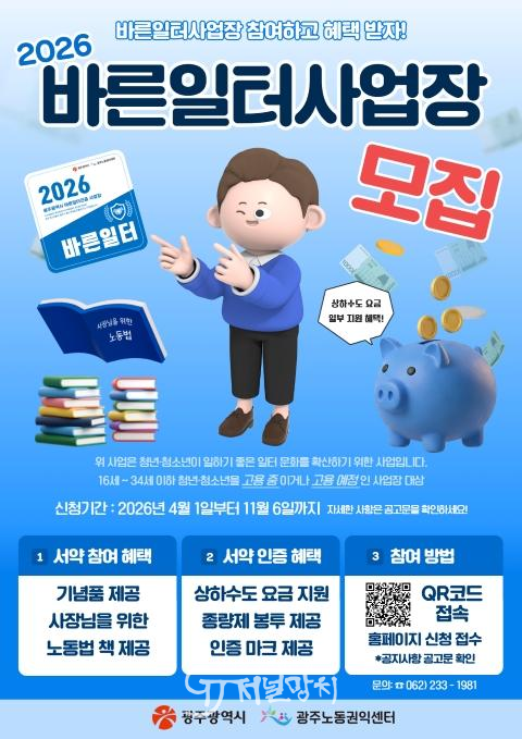 이에 따라 광주시는 노동법 준수와 인권존중을 실천하는 ‘바른일터’를 발굴·확산해 청소년에게는 안전한 일경험 환경을 제공하고 청년에게는 건강한 노동시장 진입 기반을 마련한다.