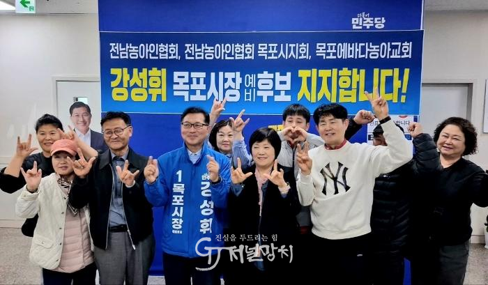 ![]() 지난 1일 사단법인 전남농아인협회 목포시지회와 목포 에바다 농아협회 회원들이 더불어민주당 강성휘 목포시장 예비후보에 대한 공식 지지를 선언했다. |