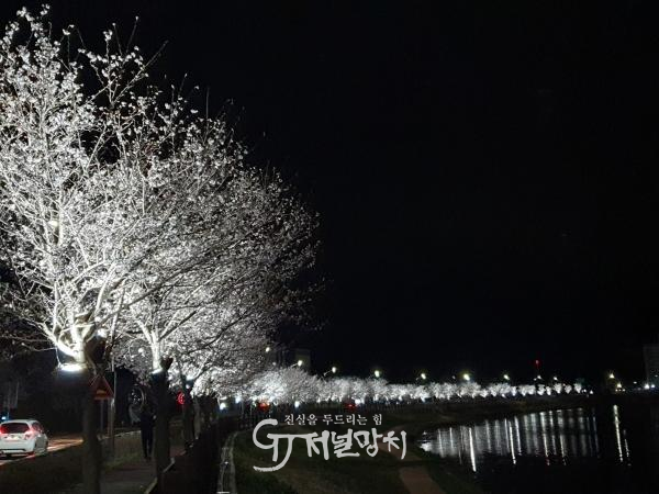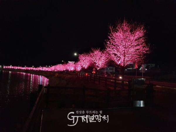 군은 단순한 조명 설치를 넘어 하천 주변 자연환경과 조화를 이루는 경관 연출에 중점을 두고 사업을 진행했다. 산책로 일대에는 연분홍과 화이트 계열 조명을 활용해 벚나무 경관을 정비했으며, 이를 통해 야간에도 밝고 안정적인 보행 여건을 마련했다.