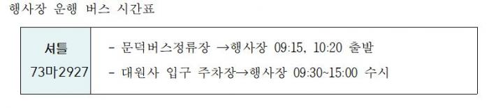 군은 행사 기간 중 방문객 편의를 높이기 위해 행사장 입구 주차장과 행사장을 연결하는 셔틀버스를 오전 9시 30분부터 오후 3시까지 수시로 운행한다.