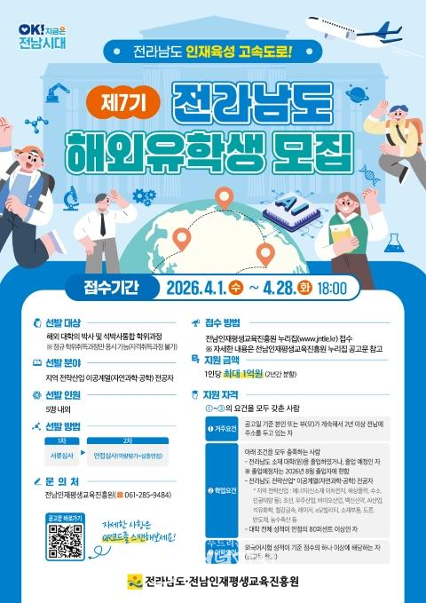 모집 대상은 공고일 현재 본인이나 부모가 2년 이상 전남에 주소를 두고 있으며, 전남지역 대학(원)을 졸업했거나 졸업 예정인 사람이다. 전남도 전략산업 관련 이공계열 전공자로 학업성적과 외국어 요건을 충족해야 한다.