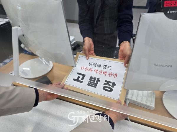 ![]() 강기정 예비후보 빛명캠프 관계자가 2일 오후 광주경찰청을 찾아 민형배 캠프 단일화 역선택 관련 고발장을 접수하고 있다. |