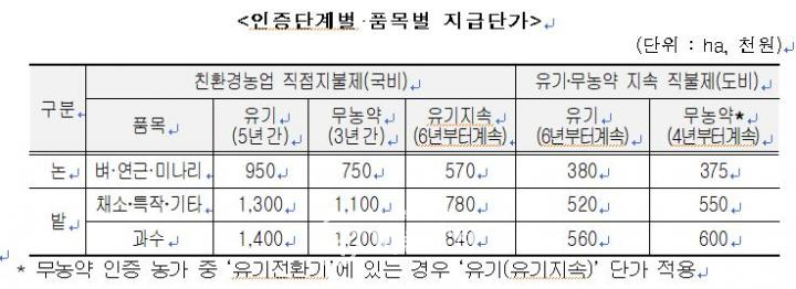 친환경직불제를 5년(5회)을 받은 농가들은 도비 사업인 유기·무농약지속직불제로 친환경농업직불제 단가의 40~50%가 지원된다. 친환경농업직불제는 올해 10월까지 친환경농산물 인증기관의 이행점검을 거쳐 인증이 유효한 것으로 통보받은 농지를 대상으로 12월에 지급할 예정이다.