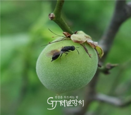 현재 매실은 일부 착과가 진행돼 직경이 7~8mm 수준으로 확인되고 있으며, 이는 복숭아씨살이좀벌의 산란 적정 크기인 1~2cm에 근접한 상태다.