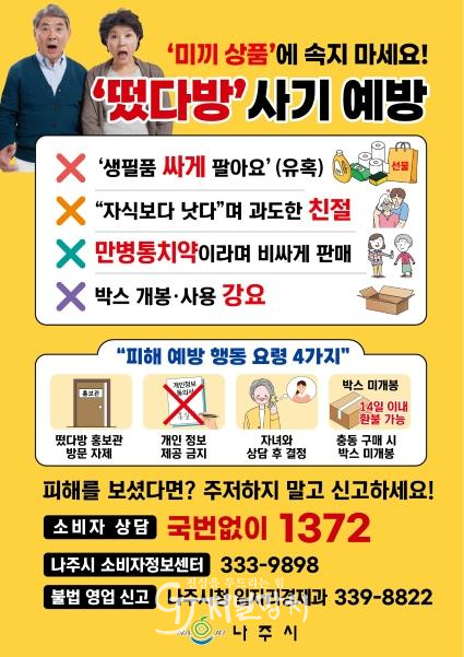 한편 방문판매 및 금융사기 등 소비자 피해 발생 시에는 한국소비자원 소비자상담센터(☎1372), 나주시소비자정보(고발)센터(☎061-333-9898), 나주시 일자리경제과(☎061-339-8822)를 통해 상담 및 신고가 가능하다.