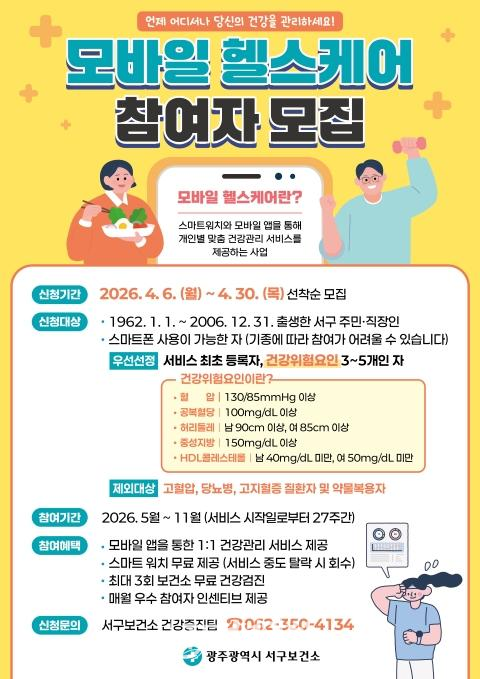김이강 서구청장은 “모바일 헬스케어는 일상 속에서 실천 가능한 건강관리 방법을 제시하는 프로그램”이라며 “보다 많은 주민들이 참여해 건강한 생활습관을 형성하길 바란다.”고 했다.