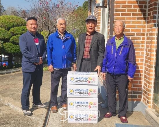 ![]() 이용기 대표가 성전면노인회의 봄나들이을 맞아 돼지고기를 전달했다. |
