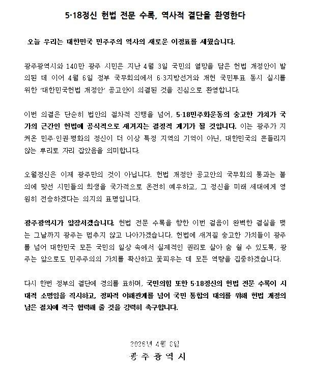 또 광주시는 “국민의힘 또한 오월 정신의 헌법 전문 수록이 시대적 소명임을 직시하고, 정파적 이해관계를 넘어 국민 통합의 대의를 위해 헌법 개정의 남은 절차에 적극 협력해 줄 것”을 강력히 촉구했다.
