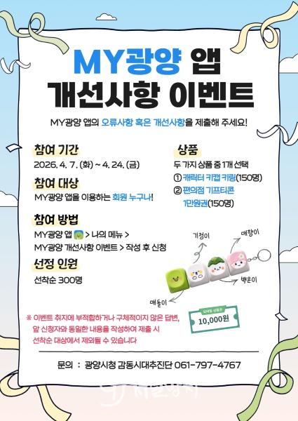 이번 이벤트는 ‘MY광양’ 앱 이용자의 의견을 수렴해 시스템 오류를 개선하고 사용자 중심의 기능을 강화하기 위해 마련됐다.