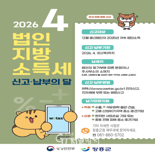 신고는 위택스를 통해 전자신고‧납부하거나, 장흥군청 재무과에 방문 또는 우편으로도 신고할 수 있다.