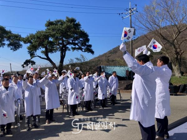 기념식은 국민의례를 시작으로 기념사, 만세삼창 순으로 진행됐다. 특히 참석자들은 태극기를 흔들고 만세삼창을 외치며 일제강점기 당시 뜨거운 독립 의지를 되새겼다.