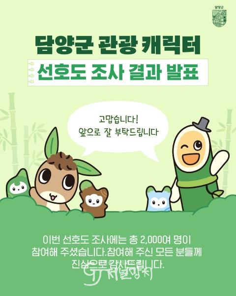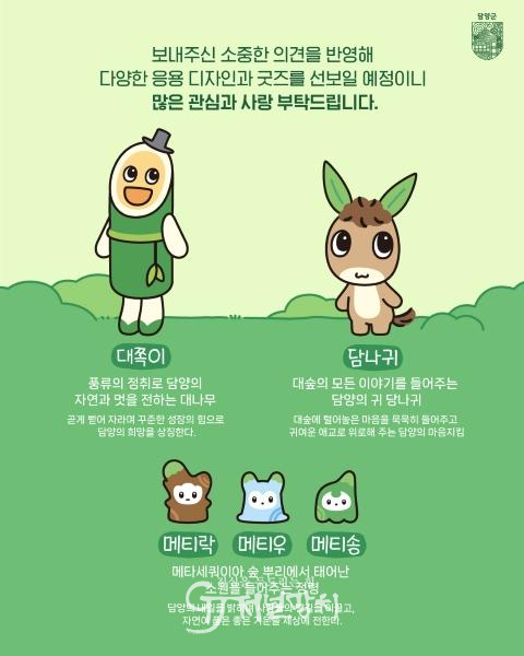 이번 캐릭터는 담양의 자연과 관광자원을 현대적이고 친근하게 재해석한 디자인으로, 지난 3월 19일부터 6일간 진행한 온오프라인 선호도 조사에서 가장 높은 표를 얻어 선정됐다.