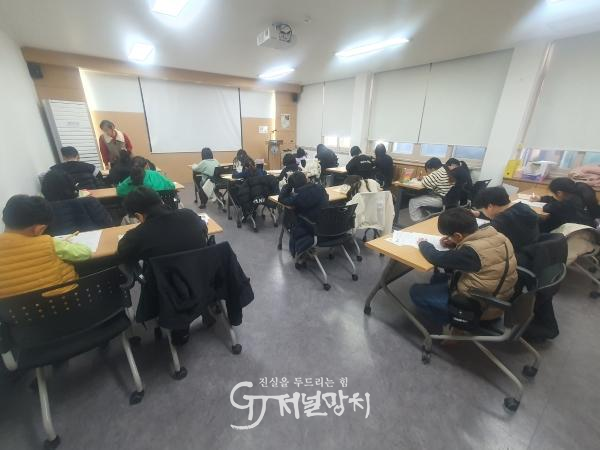 ![]() 곡성군 드림스타트 아이들이 한자 학습 지도를 받고 있다.