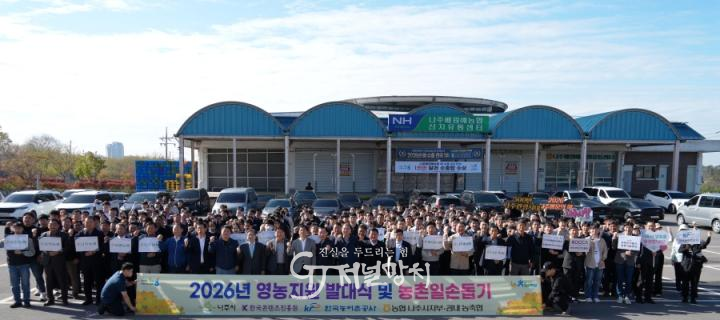 ![]() ‘2026 유관기관·범농협 영농지원 발대식 및 농촌일손돕기 행사’에서 ‘2026 나주방문의 해’의 성공적인 추진을 위한 기념 퍼포먼스를 펼치고 있다.