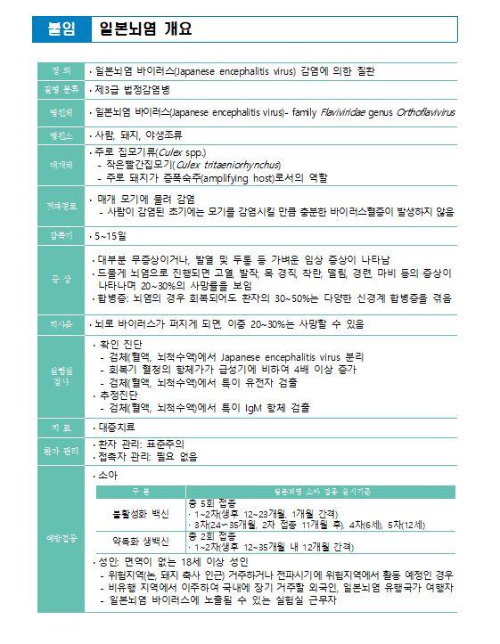 일본뇌염은 감염 시 대부분 발열, 두통 등 가벼운 증상으로 지나가지만, 뇌염으로 진행될 경우 고열, 발작, 마비 등이 나타나며 사망률이 20∼30%에 달한다. 일본뇌염은 특별한 치료제가 없고, 예방접종을 통해 예방할 수 있는 질환으로 적기에 예방접종을 하는 것이 중요하다.