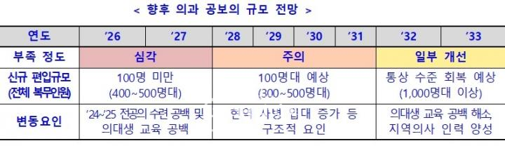 올해 공보의 배정 인원은 역대 최저 수준으로, 지난해보다 65명(의과 51명 감소·치과 1명 증가·한의과 15명 감소) 줄었다. 공보의 규모는 현역 사병과의 복무기간 차이와 여성 의대생 비율 증가, 최근 의료계 환경 변화에 따른 의대생 군 휴학 증가 등의 영향으로 감소 추세다.