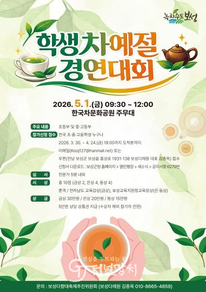 보성다향대축제추진위원회 서상균 추진위원장은 “이번 경연대회는 청소년들이 전통 차 문화를 직접 체험하고 예절의 가치를 배울 수 있는 뜻깊은 자리”라며 “전국 학생들의 많은 관심과 참여를 기대한다.”고 전했다.
