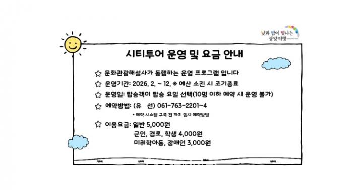 광양시티투어는 사전 예약제로 운영되며, 출발일 기준 3일 전 예약을 마감하고 10명 이상 모집 시 출발한다. 이용요금은 일반 5,000원, 군인·경로·학생 4,000원, 미취학아동·장애인 3,000원이다. 예약 문의는 061-763-2201~4로 하면 된다.