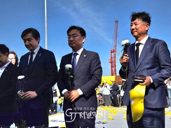 ![]() 박용안 조국혁신당 목포시장 예비후보가 지난 16일 세월호 참사 12주기 기억식에 참석해 조국 대표와 헌화하고 있다. |