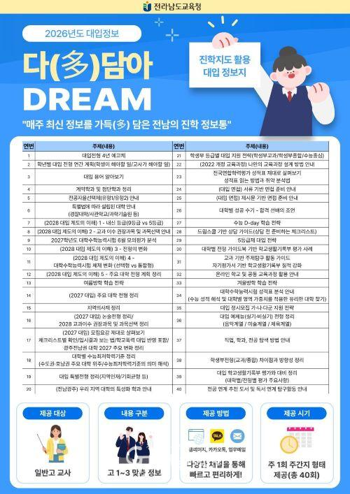전성아 진로교육과장은 “급변하는 대입 환경 속에서 교사가 최신 정보를 신속하게 활용하는 것이 무엇보다 중요하다.”며 “다(多)담아 DREAM 대입정보지가 학교 현장의 진학지도를 실질적으로 지원하는 핵심 자료로 자리 잡기를 기대한다.”고 했다.