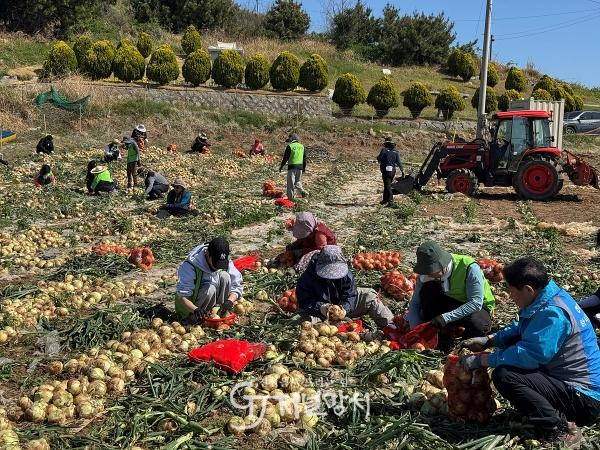 참여자들은 화양면 안포리 세포마을 600평 규모의 양파 재배농가에서 수확과 선별 작업, 양파망 작업등을 도우며 적기 영농 실현과 농가 경영 안정에 기여했다.
