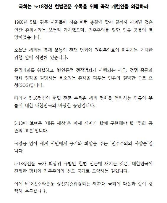 이어 유네스코 세계기록유산으로서 인류 공통의 자산이 된 5·18의 가치를 헌법 전문에 수록함으로써 대한민국 민주주의의 정통성을 공고히 하고 전 세계 민주 시민에게 연대와 희망의 메시지를 전파할 것을 촉구했다.