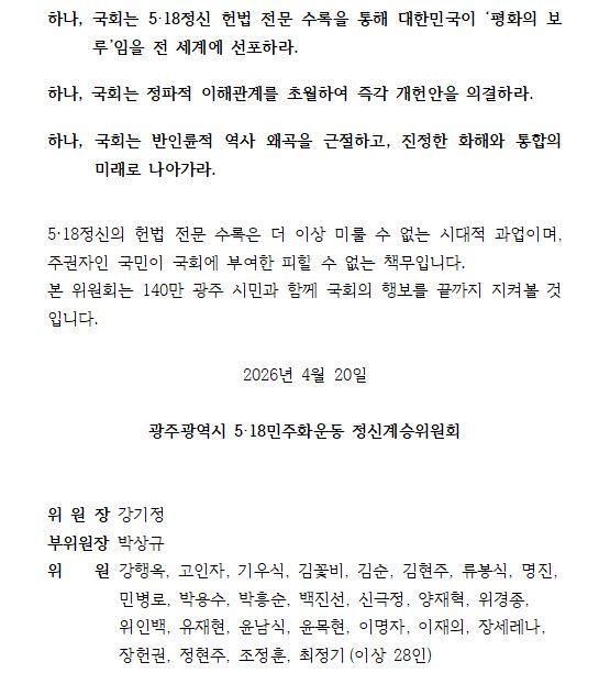 5·18정신계승위원회는 이날 성명을 통해 “1980년 5월 시민들이 총칼에 맞서 지켜낸 것은 인간 존엄이라는 보편적 가치와 민주주의를 향한 인류 공통의 열망이었다”며 “5·18정신을 국가 최상위 규범인 헌법 전문에 새기는 것은 대한민국이 진정한 평화와 민주주의의 선도 국가로 도약하는 길”이라고 밝혔다.