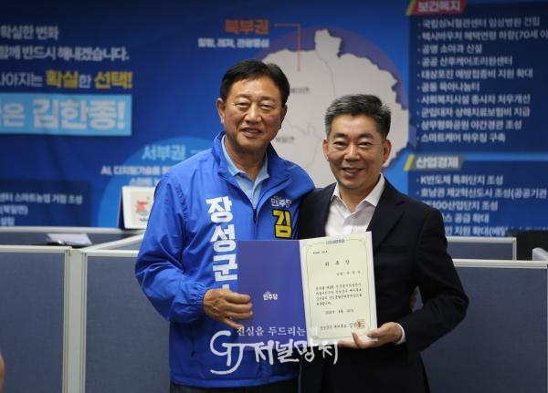 김한종 장성군수 예비후보는 20일 유성수 전 예비후보를 상임총괄선거대책본부장으로 위촉했다. 유 전 후보는 이날 오전 11시 해당 직을 수락하고 위촉장을 전달받았다.
