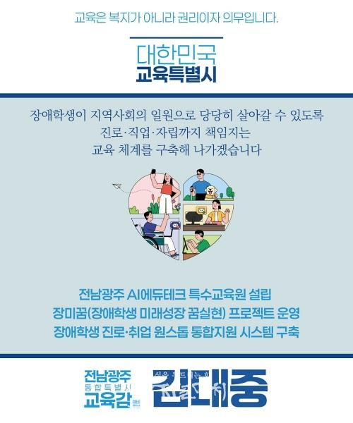 김 예비후보는 “교육은 복지가 아니라 권리이며, 특수교육 역시 국가가 반드시 보장해야 할 기본권”이라며 “장애학생이 학교를 넘어 지역사회의 일원으로 당당히 살아갈 수 있도록 진로‧직업‧자립까지 책임지는 교육 체계를 구축해 나가겠다.”고 했다.