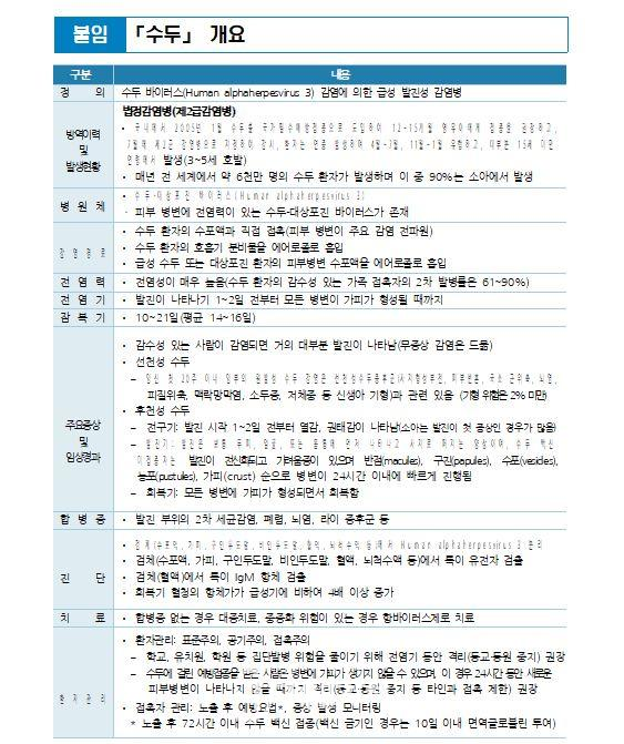 수두의 주요 증상은 발열과 함께 온몸에 수포성 발진이 나타나며, 모든 수포에 딱지가 앉기 전까지는 전염력이 유지된다. 따라서 감염이 확인되면 공동체 확산을 막기 위해 전염기간 동안 등교·등원을 중단하고 자택에서 격리 치료를 받아야 한다.