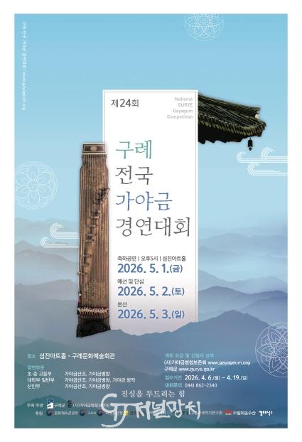 군 관계자는 “가야금 산조의 거장 서공철 명인의 고향이자 예향 구례에서 열리는 이번 대회는 경연과 기념공연이 함께 마련된 뜻깊은 자리”라며 “많은 관심과 참여를 바란다.”고 말했다.
