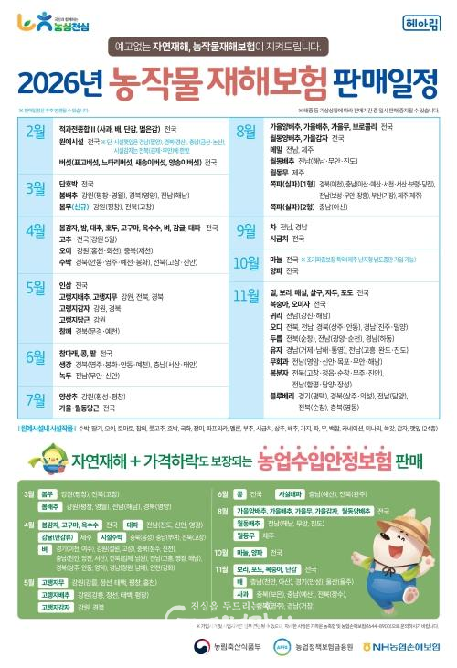 4월부터 벼·대파·고추 등을 시작으로 품목별로 순차 가입이 가능하며, 가입을 바라는 농업인은 가까운 농·축협이나 원예농협에 신청할 수 있다.