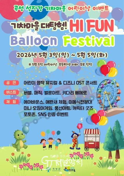 한편, 어린이날을 맞아 섬진강기차마을에서 펼쳐지는 ‘기차마을 대탐험! Hi Fun Balloon Festival’은 어린이 뮤지컬, 디즈니 OST 콘서트, 매직 일루전 쇼, DJ 랜덤댄스 공연 등이 준비돼 축제 분위기를 한층 끌어올리고, 행사 기간 동안 마술쇼, 버블쇼, 벌룬아트, 키다리 삐에로 등 참여형 버스킹 공연도 상시 운영된다.