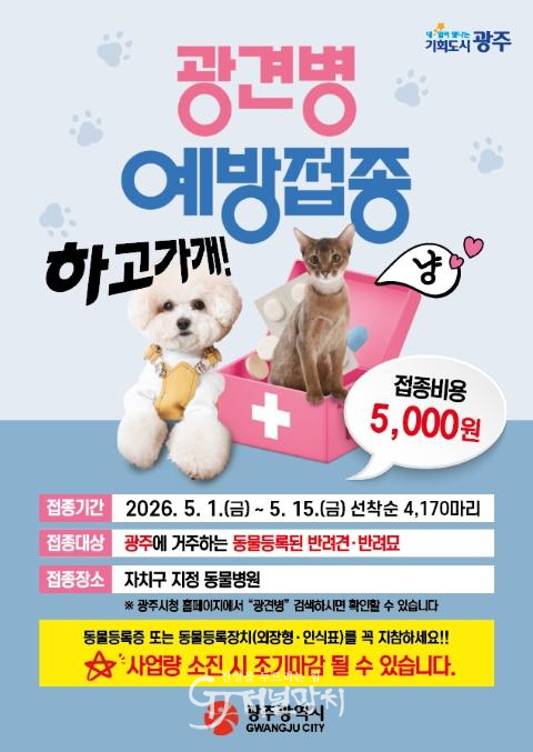 광주시는 백신 4170마리 분량을 지정 동물병원 91곳에 지원한다. 선착순이며, 사업량 소진 시 조기마감될 수 있다.